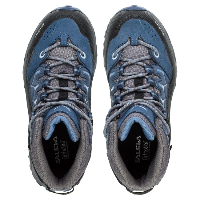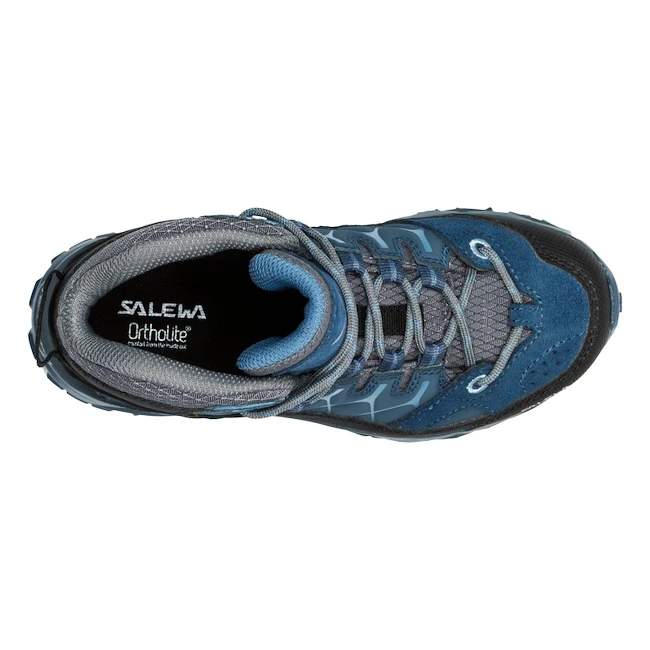 Les chaussures de sport et de randonnée Salewa JR Alp Trainer Mid GTX bleues pour enfants avec membrane Gore-Tex ont une forme anatomique pour un confort maximal.