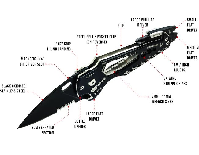 Le couteau multifonction en acier inoxydable True Smartknife+ est idéal pour le vélo, la randonnée ou le camping. En plus du couteau, l’outil remplit 14 autres fonctions. Un de ces couteaux vous fera gagner beaucoup d’espace et vous épargnera les nerfs, car vous aurez tout ce qui est important avec vous. Comme une boucle de ceinture.