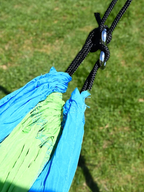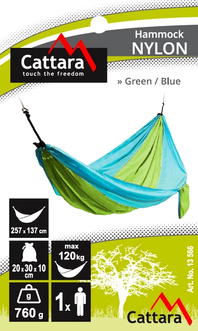 Hamac Cattara NYLON 275x137cm vert-bleu est un hamac d’extérieur en nylon, fixé avec une corde. Le filet est équipé d’un crochet aux deux extrémités pour un accrochage facile et rapide à la corde. Les cordes sont fabriquées en fibre souple et flexible. Le filet peut être enroulé et plié dans un petit sac.