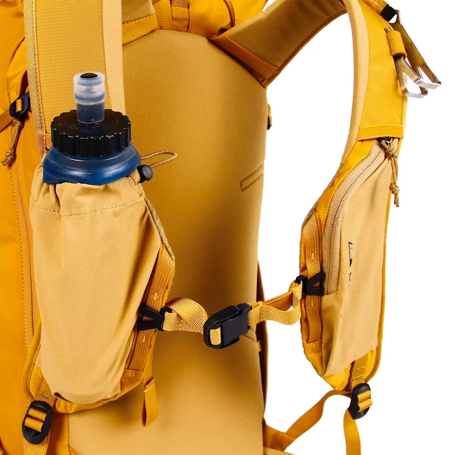 • Sangles de compression latérales avec crochets en G en aluminium qui servent de système de support de ski en A