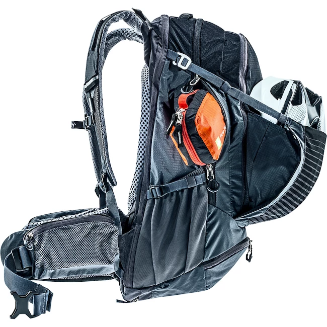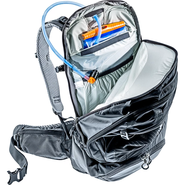 Le sac à dos a une poche pour les outils de vélo, une poche pour une pompe, une poche pour un téléphone portable et une carte, deux poches élastiques pour les protège-tibias et un porte-casque. Pour les minimalistes, la chambre basse est proposée comme rangement pour un sac de couchage.