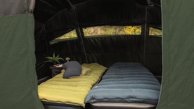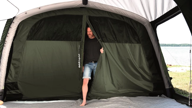 Les deux chambres Premier de peuvent accueillir un total de 5 personnes. La cloison entre les chambres est amovible, ce qui permet de créer un grand espace de couchage. Le confort et la tranquillité d’esprit pendant le sommeil seront assurés par les plafonds et les murs sombres de. Les chambres sont accessibles par des portes spacieuses qui peuvent être ouvertes de deux façons. Le premier est le système Quick and Quiet, qui, grâce à des bandes magnétiques verticales, permet une ouverture rapide et silencieuse de la porte. La deuxième méthode permet ensuite une fermeture plus sûre grâce aux fermetures à glissière. Des entrées couvertes pour les rallonges électriques vous permettent de brancher une lampe ou de charger votre téléphone portable.