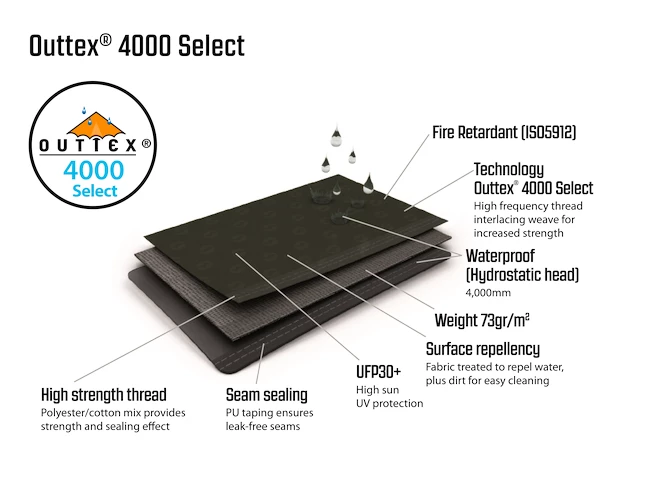 La tente Oakdale est une tente à trois zones, ce qui signifie qu’en plus des chambres et du couloir classique avec un étage, elle dispose également d’une véranda couverte à l’avant qui peut servir de salle à manger ou de lieu de détente, où vous serez sous le toit, mais vous ne perdrez pas le contact avec la nature environnante. La véranda et le couloir intérieur ont une large entrée panoramique avec moustiquaire, qui peut être ouverte à volonté grâce à quatre fermetures éclair. En outre, grâce à la porte intérieure, il est possible de séparer les deux couloirs. Vous pouvez également utiliser l’entrée latérale pour entrer dans le couloir. Le couloir spacieux abrite le salon de l’aile, qui est un salon que vous pouvez utiliser pour vous détendre, prolonger la salle à manger ou comme espace de rangement pour vos affaires. Une ventilation parfaite est assurée par les bouches d’aération situées sous les fenêtres du couloir et sur le mur arrière près de la chambre à coucher. Les ouvertures sont recouvertes d’une moustiquaire et peuvent être fermées par une fermeture éclair.