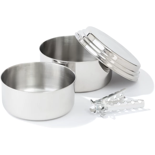 Le set de 2 casseroles MSR Alpine est un set de quatre pièces en acier inoxydable. L’ensemble de 2 casseroles Alpine est un ensemble de batterie de cuisine durable et léger conçu pour deux personnes. Il est fabriqué en acier inoxydable très résistant, fiable même dans les conditions les plus extrêmes. Le couvercle s’adapte aux deux pots et peut être utilisé comme une assiette.