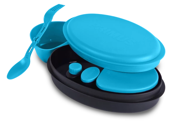 Le Primus Meal Set Blue est un ensemble complet de huit pièces qui comprend tout ce dont vous avez besoin pour manger à l’extérieur. L’ensemble comprend : deux assiettes creuses, un porte-épices à trois compartiments, un petit récipient pour l’huile ou le liquide vaisselle, un récipient de rangement avec couvercle hermétique, une tasse pour l’extérieur, une cuillère et une fourchette pliantes et une planche à découper tout en un, une passoire, une râpe et un couteau. L’ensemble de salle à manger passe au lave-vaisselle et au micro-ondes.
