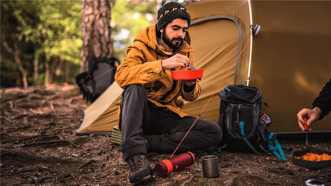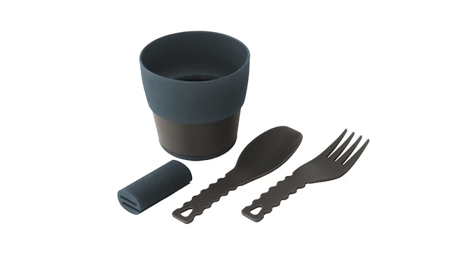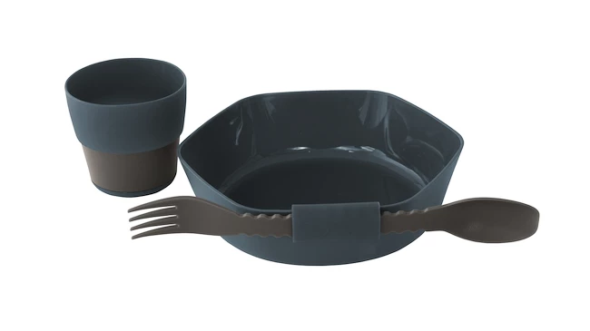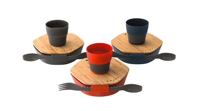 Le kit repas Leaf multi-pièces de Robens impressionne par son design élégant et ses dimensions compactes. L’ensemble comprend 1 bol, 1 couvercle/goulot, 1 cuillère, 1 fourchette et 1 tasse. Dans l’ensemble, vous trouverez également un « connecteur », qui relie la cuillère et la fourchette, où vous pouvez également régler la longueur souhaitée, un élastique avec un motif qui maintient l’ensemble et un sac portable. L’ensemble est fabriqué en polypropylène, en silicone et en bambou, ce qui lui confère un aspect élégant.